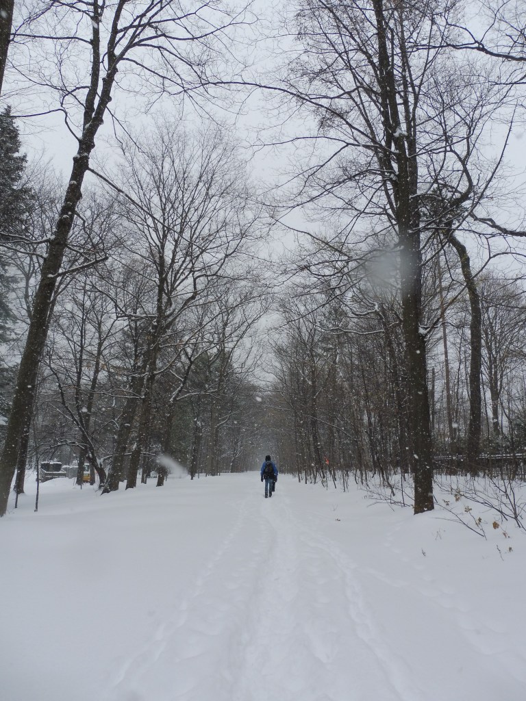 Nous sommes toujours dans le même Helpx et ça se passe toujours bien. Tellement bien que, lorsqu’il y a eu les bons centimètres de neige un peu avant la mi-novembre, nous sommes partis deux fois avec le plus grand des garçons de la maison (l’autre était malade) en exploration dans la neige. Une première fois nous sommes retournés au parc du bois de Coulonge. Nous étions émerveillés par cette belle neige qui continuait de tomber et qui laissait une belle couche sur le sol. Cela faisait très longtemps que nous n’en avions plus vu autant! Nous étions comme des enfants et nous en avons bien profité ! Il y a eu évidemment une petite bataille de boule de neige mais elle était un peu poudreuse ce qui rendait difficile la formation de boules.