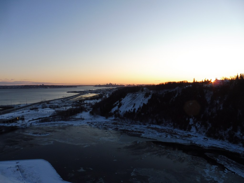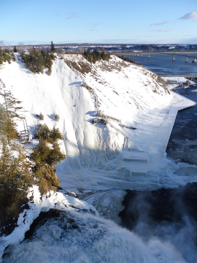 Le lendemain nous sommes repartis avec lui pour découvrir le parc de la chute Montmorency. Après un long trajet de bus, nous arrivons sur place. Normalement l’entrée est payante mais pas en cette période de l’année. Il y avait encore beaucoup de neige et le spectacle valait le temps du trajet. La chute est vraiment impressionnante. Plus haute que celles de Niagara. Et avec la neige et le froid c’était exceptionnel! Malgré le froid nous faisons le tour du parc mais certaines parties sont fermées. Il faut alors faire des détours pour pouvoir accéder à certains endroits. Nous avons eu une belle frayeur en faisant le dernier détour car nous ne retrouvions plus Isaac (le garçon), alors qu’il marchait derrière nous. On a cherché, crié après lui mais on je le retrouvait pas. Au final nous l’avons retrouvé il était simplement contre un mur et s’était enfoncé dans la neige jusqu’au épaules. Il ne nous avait pas entendu. Après ces émotions et un dernier regard sur la chute au coucher du soleil nous sommes rentrés au chaud.